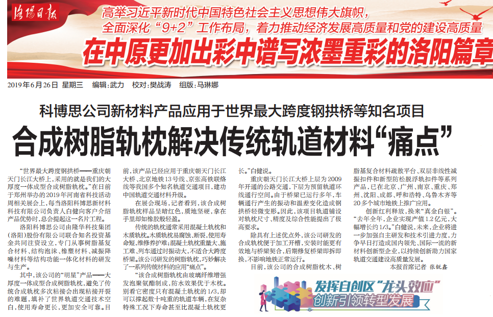 官宣:合成樹脂軌枕解決傳統軌道材料“痛點”-----洛陽科博思新材料科技有限公司接受《洛陽日報》專訪